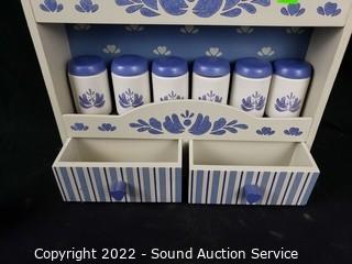 Lot Details: 12 spice jars, 2 drawers in rack. 14" H x 13.5" W x 3.25" D.