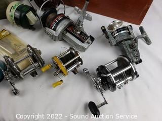 Lot Details: Ryobi SX5, Penn #49 Deep Sea, Penn #10, Penn #9 Level Wind, Great Lakes S-30, Zebco 404, & other reels., various weathering & wear from age, use. Plano 6200 Tackle box with line & some tackle. Wooden tackle box with various tackle. Refer to photos for contents. 7" H x 12.5" x 8.5" & 8" x 15.5" x 8" tackle boxes.