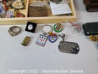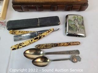 Lot Details: 1 ring marked 925, Faultless No.122 straight razor, fountain pin, other trinkets & jewelry. 2" x 10" x 5" to 2.1" x 11.5" x 7.5".