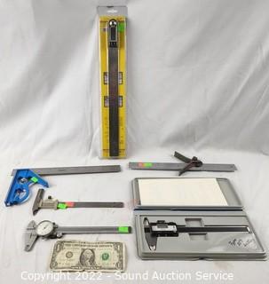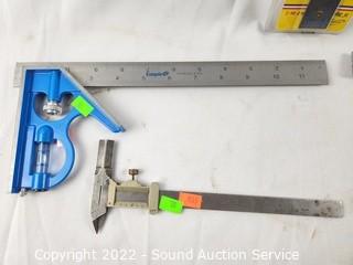 Lot Details: Fowler Slyvac & other calipers, Empire & other combination squares. Refer to photos for contents.