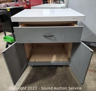 Lot Details: Single drawer with ball bearing drawer guides, lower cabinet, grey finish. On heavy duty 3" casters for easy movement. Some scuffs and wear to finish. Overall good condition. 34" H x 32" W x 27.5" D.