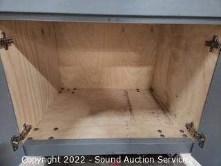 Lot Details: Single drawer with ball bearing drawer guides, lower cabinet, grey finish. On heavy duty 3" casters for easy movement. Some scuffs and wear to finish. Overall good condition. 34" H x 32" W x 27.5" D.