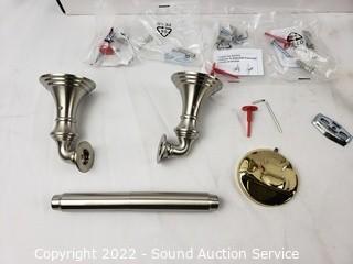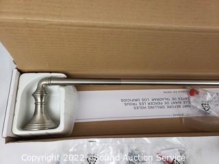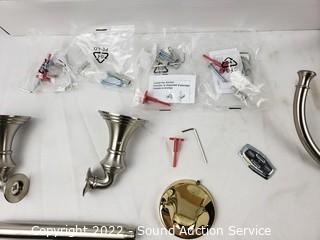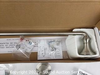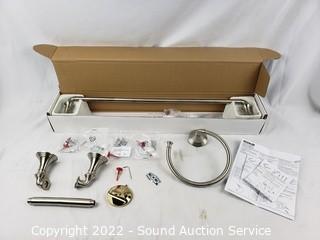 Lot Details: 24" towel bar, towel ring, toilet paper holder, robe hook. All in original packaging. All appear complete.