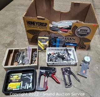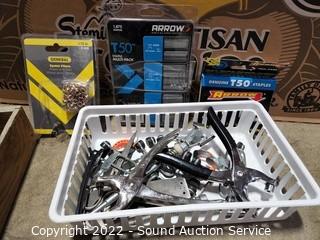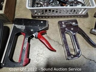 Lot Details: Staple guns, staples, files, rasps, eyelet pliers, snips, prybars & more. Refer to photos for lot contents.