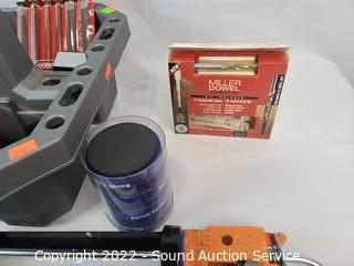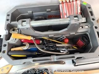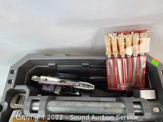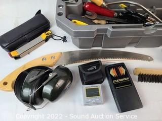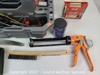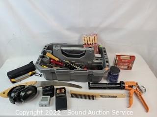 Lot Details: Hand saw, ear protection, files, scissors, clamps, caulk gun, wrenches & more. Refer to photos for lot contents. 6" x 13" x 19".