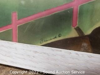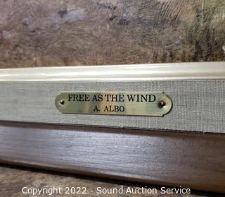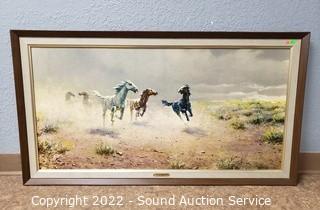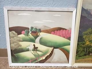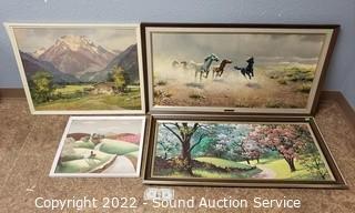 Lot Details: Bernard signed horse print, 19" x 17". Cherry Blossom Trail print, 42" x 20". Mt. Farm print, by E.C.W. Retzloft 30" x 23.5". A. Albo "Free the Wind" horse print, 44" x 24".