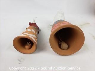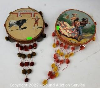 Lot Details: Pottery vessel/vase, bowl, tambourine, pottery bell, finger cymbals, whistle/flute.