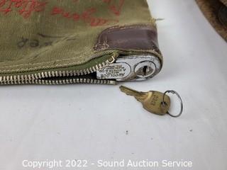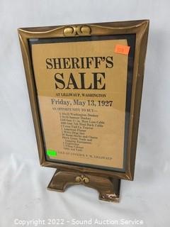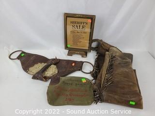 Lot Details: Leather chaps 33" long overall, 22"? waist, some wear from use. Bronco rodeo handle?, locking Citizens bank bag with key, 10" x 7", 1927 Sheriff's Sale Sign.