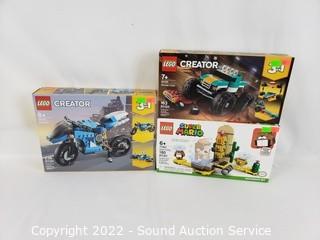 Lot Details: Monster Truck #31101, Super Mario #71363, Creator 31114. All appear sealed.