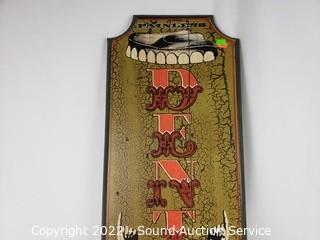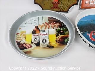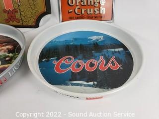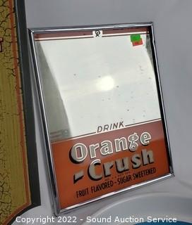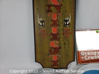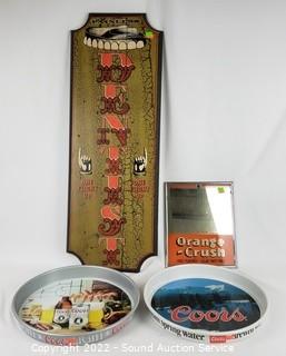 Lot Details: Orange Crush Mirror 11" x 9", dent on right side of frame. 2 Coors Light Tin Trays, 13" dia. "Dentist" Wood Sign, 32" H x 11.5" W.