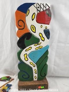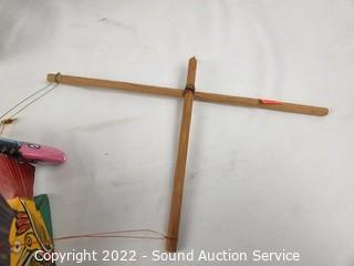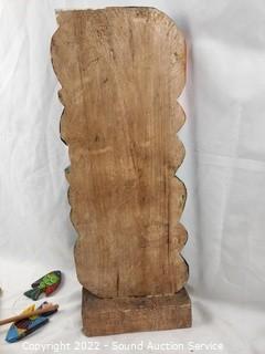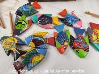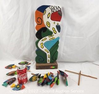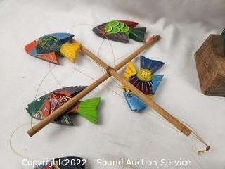 Lot #0166: Carved Wood, Painted Fish Mobile & Tote, Figure