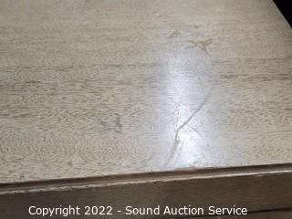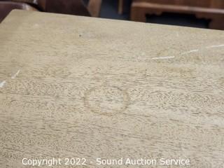 Lot Details: Solid wood construction, dovetail joinery. Some wear to finish, scuffs, scratches, etc. 40.5" H x 30" W x 18" to seat. Matches the next lot.
