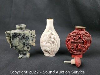 Lot Details: 2 Jade, ceramic, cinnabar, hand painted. 5 have intact scoops. 1 missing the scoop, one missing cap has scoop. Up to 2.5" tall.