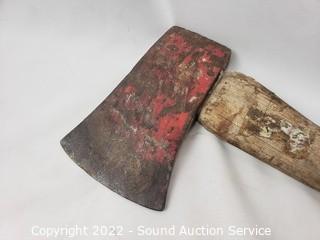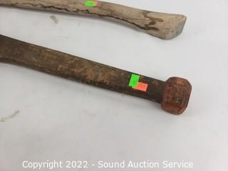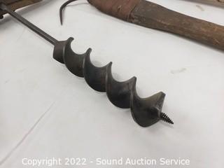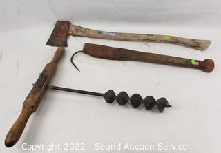 Lot Details: 18" L 2" bit hand auger, 22" gaff hook, 27" splitting axe. Various wear from age, use.