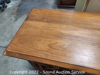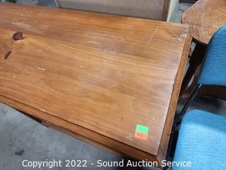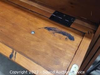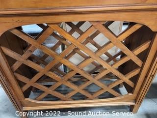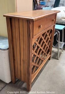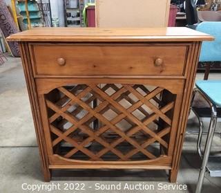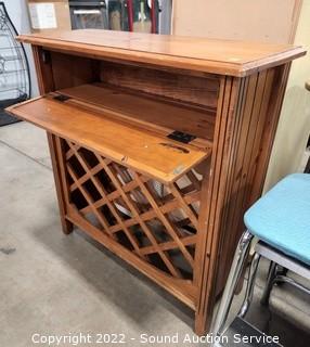 Lot Details: Drop leaf cubby. Believe will hold 18 bottles. Some wear to finish, scuffs, scratches, etc. 33" H x 34" W x 12" D.