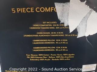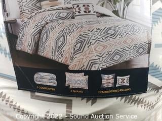 Lot Details: 1 comforter 104" x 96", 2 shams 20" x 36", 2 embroidered pillows 18" x 18" & 12" x 18". Case is dirty on the bottom, otherwise no issues.