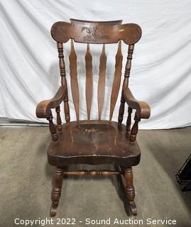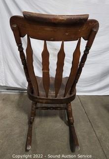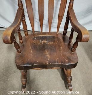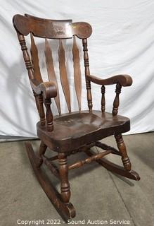 Lot #0021: Wood Slat Back Contoured Seat Rocking Chair.