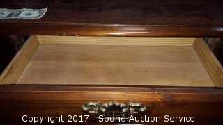 Approx. 28.5" tall, 54" wide and 18" deep. Does have some damage on the legs, otherwise in good condition.