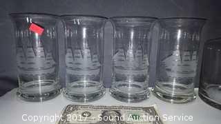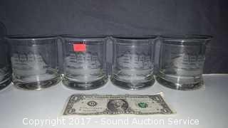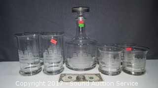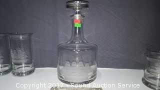 Lot #0035: Ship Etched Glass Decanter Highball & Drink Glasses