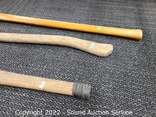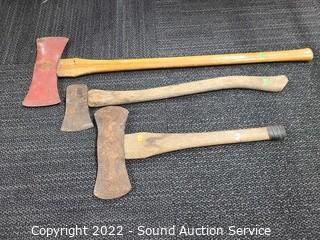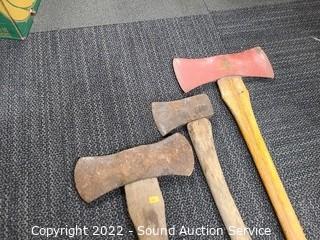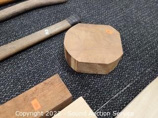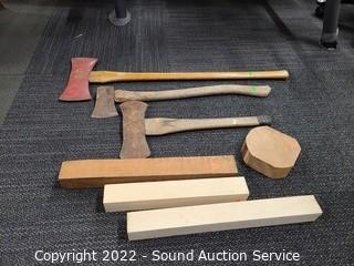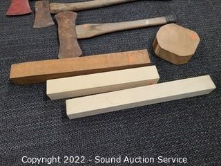 Lot #0225: 3 Splitting Axes, 4 Pieces of Carving Wood