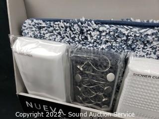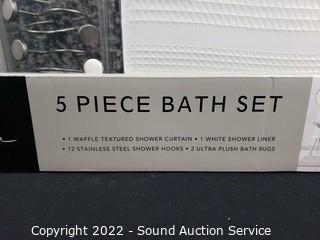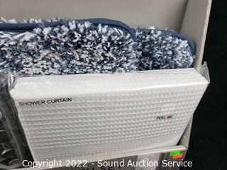 Lot Details: 2 plush rugs, 17" x 24" & 21" x 34", waffle textured shower curtain 70" x 72", 1 white shower liner 70" x 72". 12 stainless shower hooks.