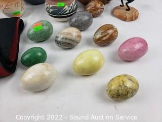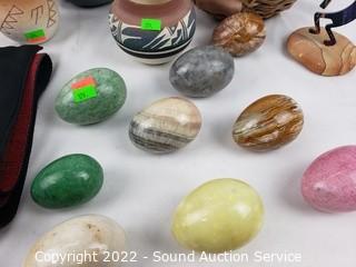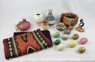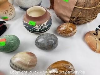 Lot #0179: Assorted Native Pottery, Basket, Stone Eggs