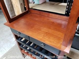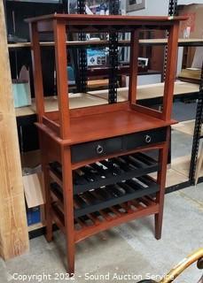 Lot Details: Place to hang glasses, single drawer bottle rack. 59.5" H x 31" W x 18" D. Some light wear to finish.