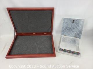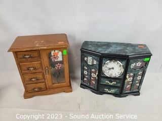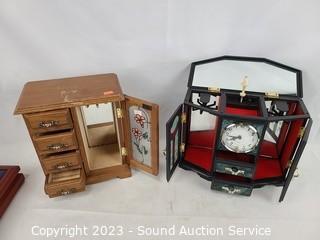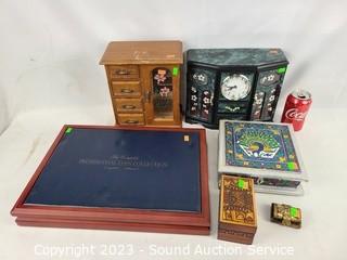 Lot Details: Most with some cosmetic wear, one with clock (second hand not attached, clock not functioning). 1" x 2.5" x 1.75" bone trinket box, 2.5" x 12" x 17", 10" H x 9" x 5".