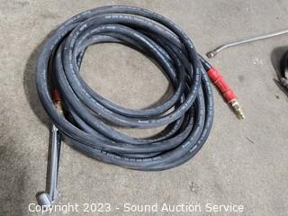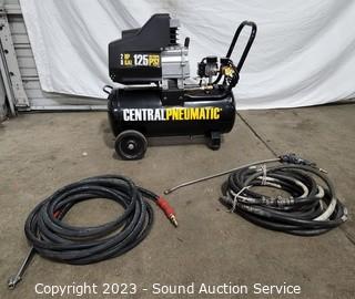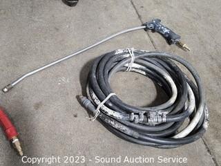 Lot Details: Works. Comes with 2 hoses & air spray wand. not sure on hose length approx. 25-50ft.