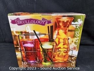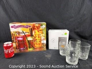 Lot Details: 4pc Bormoili Stone 13.25oz Highball Glasses, 10pc Skullology 38oz carafe, 16oz color coolers. Both in original packaging.