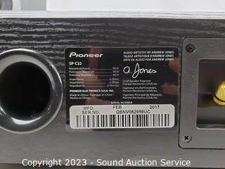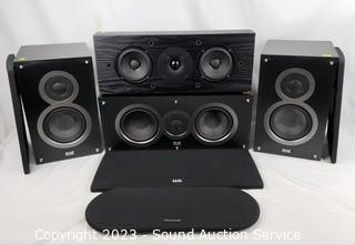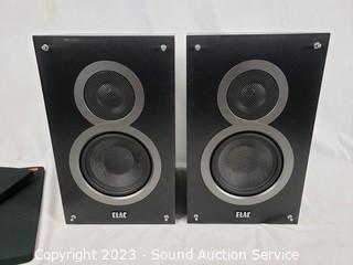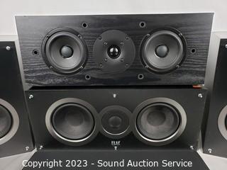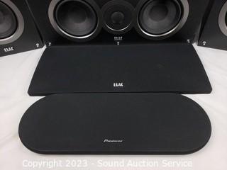 Lot Details: 2 Elac 2-Way B5 bookshelf speakers, 13" H x 8" W x 9.5" D. 1 Elac C5 3-Way center speaker, 8" H x 18" x 9.5". Pioneer 3-Way SP-C22 center speaker. 18" x 7" x 8". Some minor scuffs & scratches, no major issues.