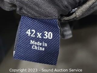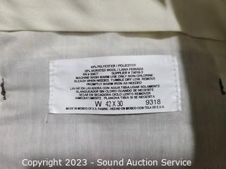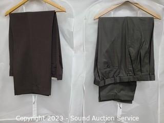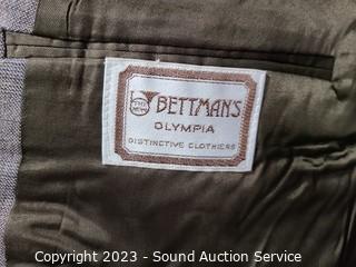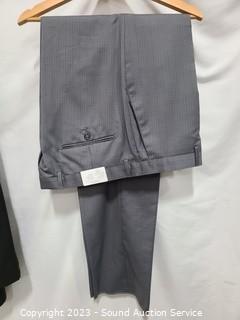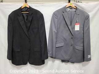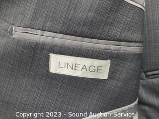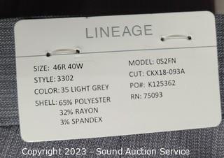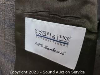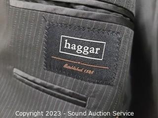 Lot Details: Haggar black pinstripe polyester blazer S:48L. Lineage Gray 2pc Polyester Suit S:46R blazer, 46R/40W slacks. Betman's Olympia Blazer & Slacks Don't see any sizes. Joseph & Feiss Lambswool 2pc Suit 50R blazer, 42/30 slacks. All in great condition, Lineage still has tags. All with storage bag.