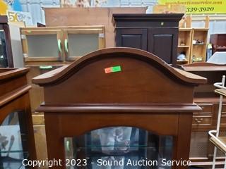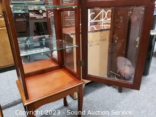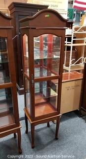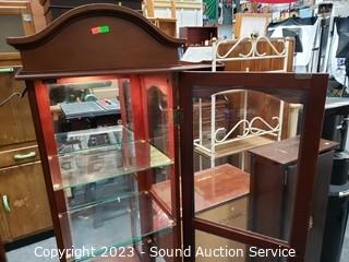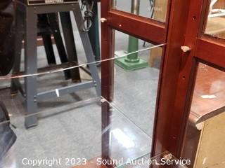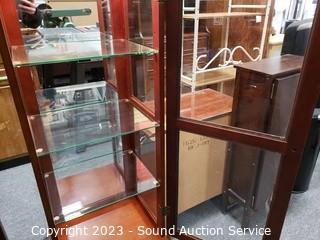Lot Details: 59" H x 15" W x 11" D. Glass shelves, mirrored back. Mirror is cracked horizontally at middle shelf, otherwise in great cosmetic condition.
