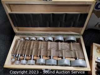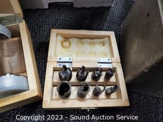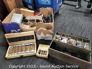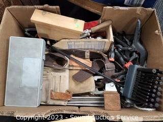 Lot Details: Punch set, spring clamps, router bit set, tool box, leather tool belt, block pulley, number punch, tap & die kit.