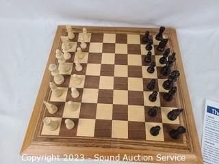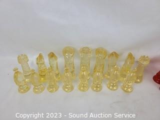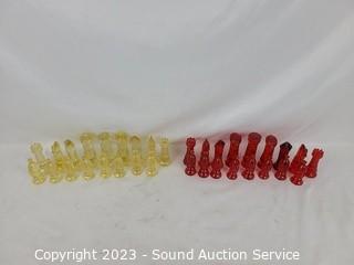 Lot Details: Also comes with spare acrylic/resin chess pieces. Dark stain board is missing some pieces. Enough pieces for 3 complete sets. Approx. 15.5" x 15.5" to 19" x 19" boards.