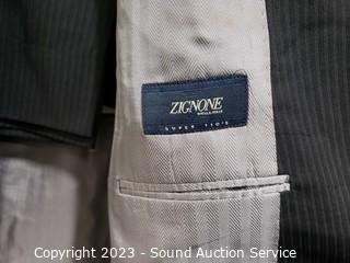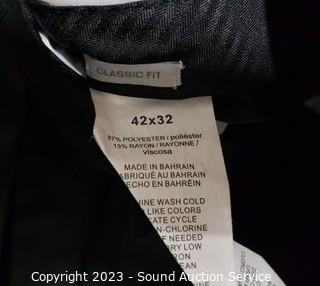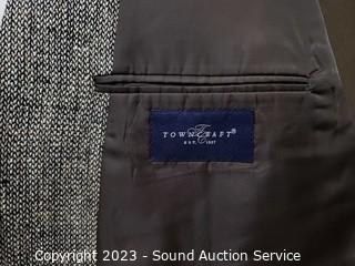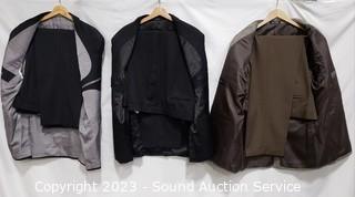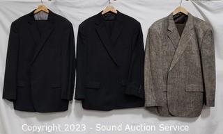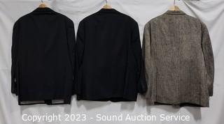 Lot Details: Joseph Abboud 100% Wool Blazer S:48R, Slacks S:42W. Joseph Feiss 100% Wool Blazer S:48R, Slacks Perry Ellis S:42/32. Town Craft Silk/Polyester Blazer S:48R, Slacks S:42/32. All with storage bags.