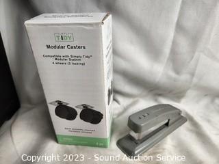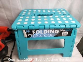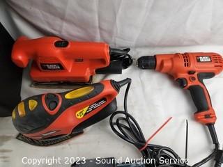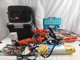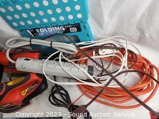 Lot Details: 3 Ext. cords, 1 power strip, 1 step stool, 1 bag, 1 foot pump, sanders, drill (both work) & more.