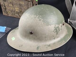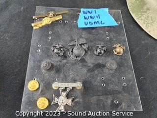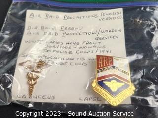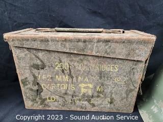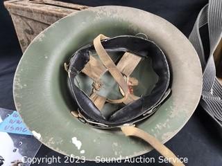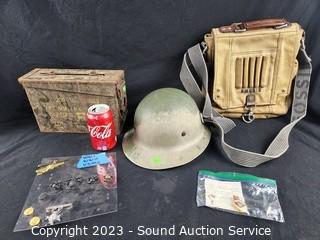 Lot Details: 7.62mm Ammo Can, helmet, WWI, WWII pins, medals, Fossil satchel 11" x 11". Refer to photos for condition & more information.