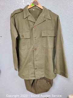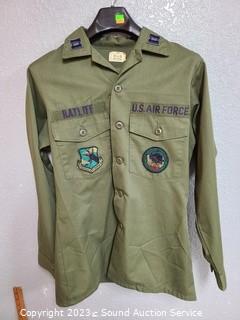 Lot Details: Denim shirt don't see a size, wool? pant's 34x31, 15.5x33 Air Force shirt, 32W slacks.