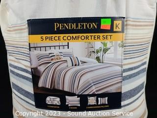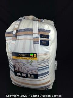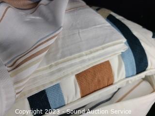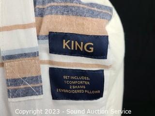 Lot Details: Savanna Stripe Ivory print. 1 king comforter 104" x 96, 2 shams 20" x 36", 2 embroidered pillows 18" x 18" & 12" x 16". Don't see any issues.