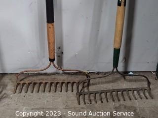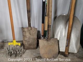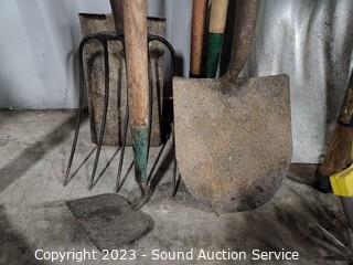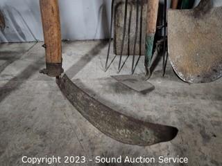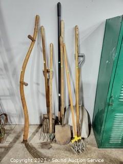 Lot Details:  Thatcher, snow shovel, flat head shovels,  scythe, potato fork, brush rakes, hoe.