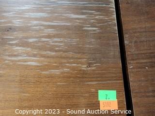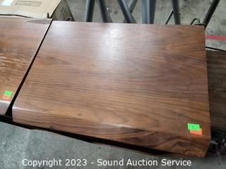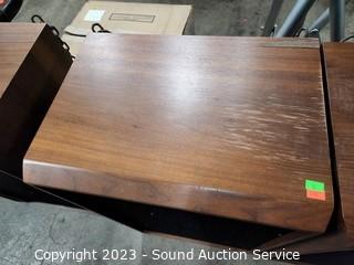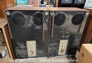 Lot Details: Teak finish. Both work. One speaker has a broken input for speaker wire & high level frequency knob is stiff, hard to turn. Some wear to finish on cabinet. Have chains mounted to the back for hanging. 27" H x 17" W x 12".