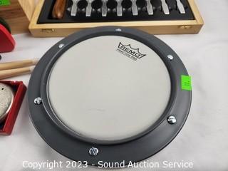 Lot Details: Practice pad, drum sticks, pitch instrument, maracas, pitch instrument, tambourine, cymbals.