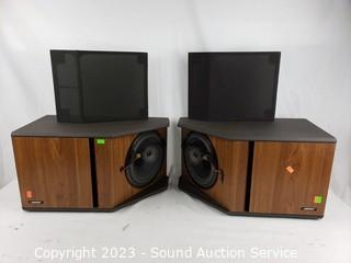 Lot Details: 10" H x 17.5" x 9.5". Both work, cabinets have some scuffs, scrapes, don't see any issues with speakers.