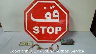 Lot #0130: Stop Sign, Schilling Harmonica & Handcuffs