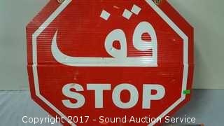 Handcuffs don't need a key, harmonica is in original case, stop sign is in English and Arabic.