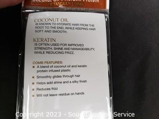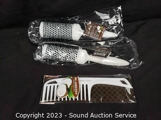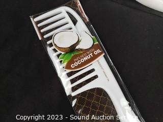 Lot Details: Comb and 2 round brushes, infused with coconut oil, all appear unused.