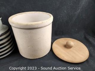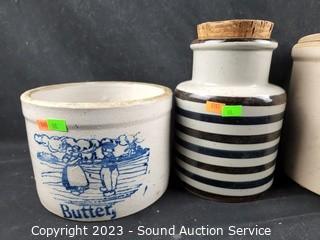 Lot Details: One marked butter has no lid 5" x 7" Dia, one with cork 7.5" H x 5.5" Dia, and other with wood lid 7.5" x 7.5".