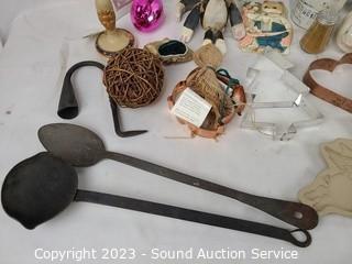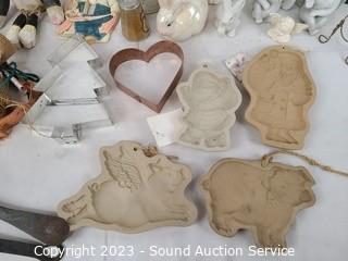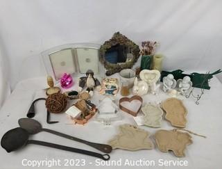 Lot Details: Ceramic light switch cover, molds, vases, cookie stamp, photo frame, cast iron ladles, etc. Refer to photos for more info.