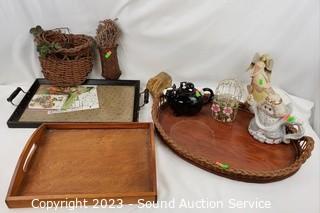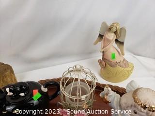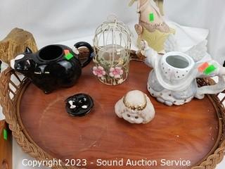 Lot Details: Tray's, angel figure & teapot, bird cage votive, cat teapot.